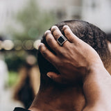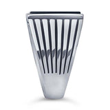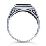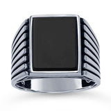 This signet-style sterling silver ring is set with a rectangle-cut black onyx cabochon and features ridged detailing on the shank and decorative touches set into the top and bottom edges of the bezel, giving the ring a look of depth and substance. Behind the stone, the ring is convex—the hollow back reduces the weight of the ring so that it's comfortable to wear and reduces material costs. The ring has a bright finish, oxidized to highlight its rich texture.